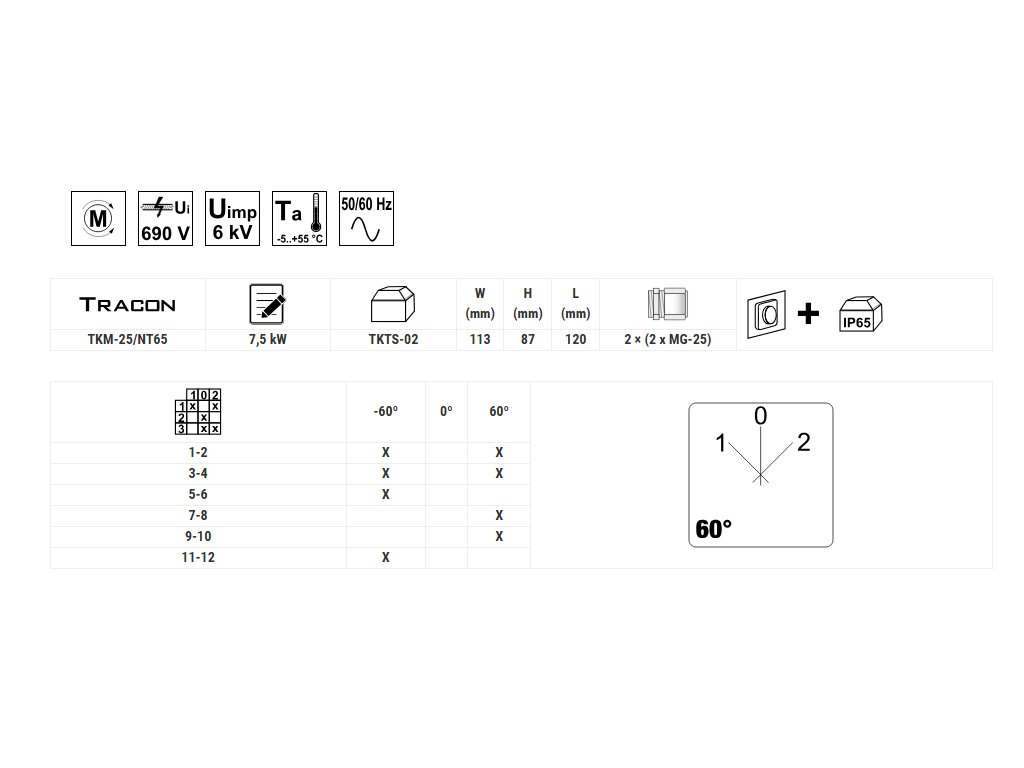 přepínač reverzační TKM-25/NT65 1-0-2 25A 7,5kW IP65